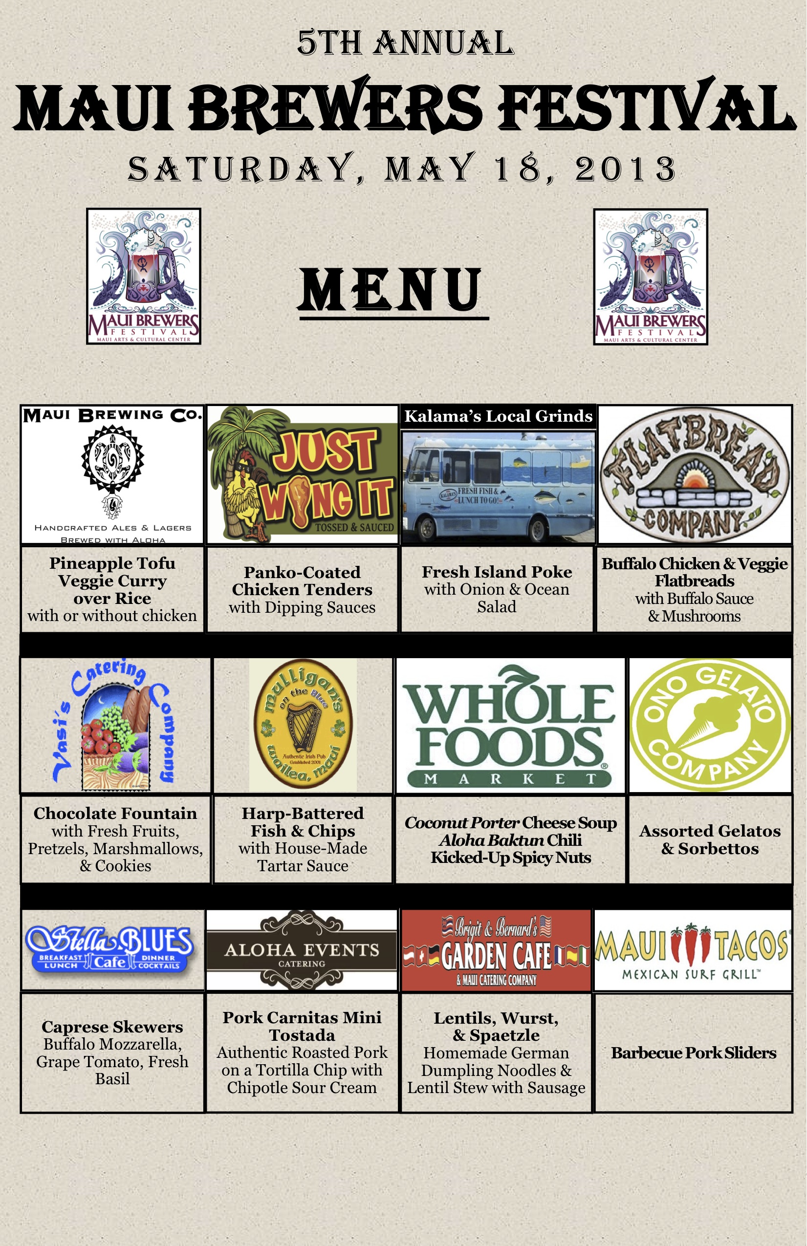 Maui Brewers Festival 2013 Food Vendors Menu Published May 10, 2013 at 1651 × 2550 in 2013 Maui Brewers Festival List of Breweries ← Previous Next → Share this: Click to share on X (Opens in new window) X Click to share on Facebook (Opens in new window) Facebook More Click to email a link to a friend (Opens in new window) Email Like Loading...